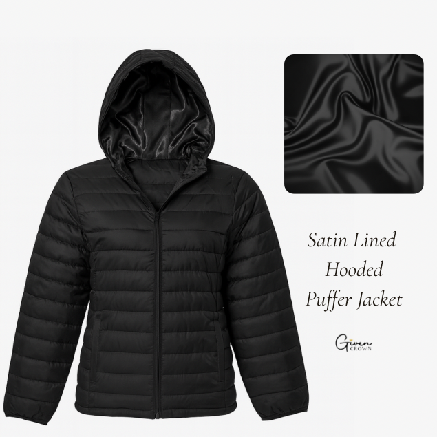 satin lined puffer coat, satin lined winter coat, satin lined jacket for natural hair, frizz free winter coat, satin hood jacket, curly hair winter coat, protective hair jacket, satin lined hood, natural hair protection, satin lined outerwear, satin lined cold weather coat, given crown satin jacket, hair friendly puffer coat, luxury satin winter wear
